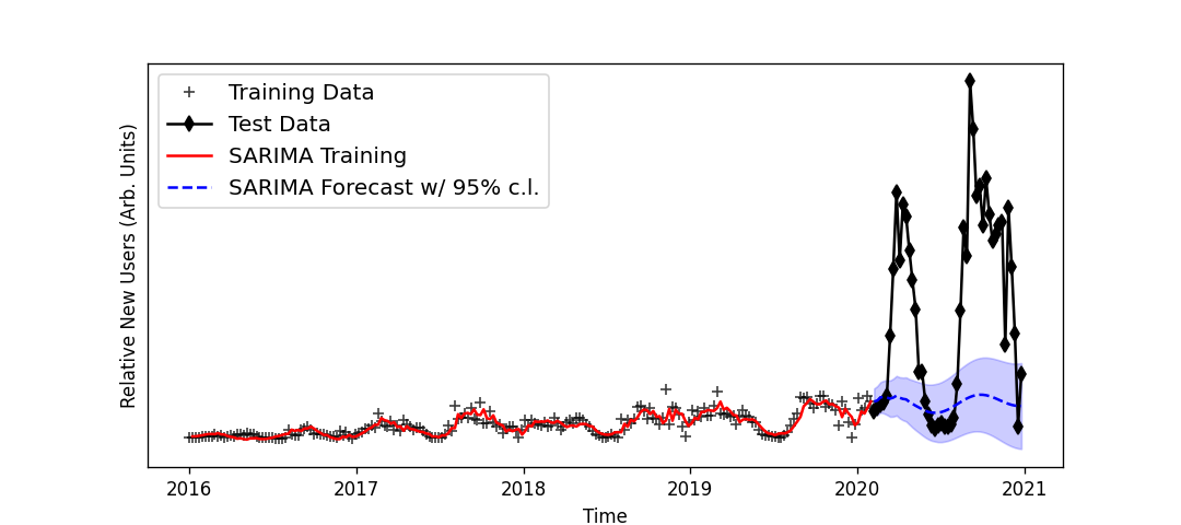 Daily new educational users for Soundtrap in the United States. The (gray) plus points show the pre-COVID data used to train the SARIMA model, and the (black) diamond points show the COVID test data. The (red) solid line shows the SARIMA model performance after training and the (blue) dashed line shows the SARIMA forecast. The blue band shows the 95% c.l. on the forecast model.